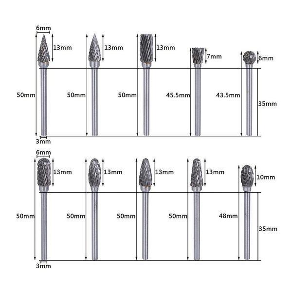 Der10 in 1 Wolframstahl-Schleifkopf (10 PCS) besteht aus einem umgekehrten Kegel, einem spitzen Kegel, einem runden Kegel, einem spitzen Baumkegel, einem Kugelkegel, einer Flamme, einer Kugel, einem Oval, einem Zylinder und einer runden Zylinderspitze!
