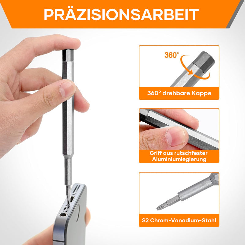 24 Präzisions-Schraubendreher-Bits: Das Set enthält 24 Präzisions-Schraubendreher-Bits, die sorgfältig ausgewählt wurden, um zu einer Vielzahl von auf dem Markt erhältlichen Schrauben für elektronische Geräte zu passen.