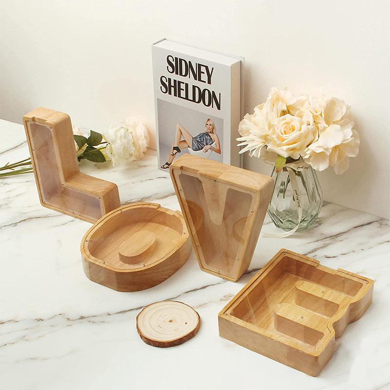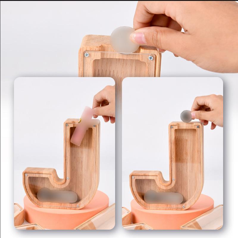Außen: Dieser hölzerne Vorratstank-Buchstabe ist ein schönes Geschenk für Jungen und Mädchen jeden Alters. Es ist ein langlebiges, praktisches und lehrreiches Holzspielzeug. Durch ein organisches Glas kann ein Kind das Wachstum seiner Ersparnisse beobachten.