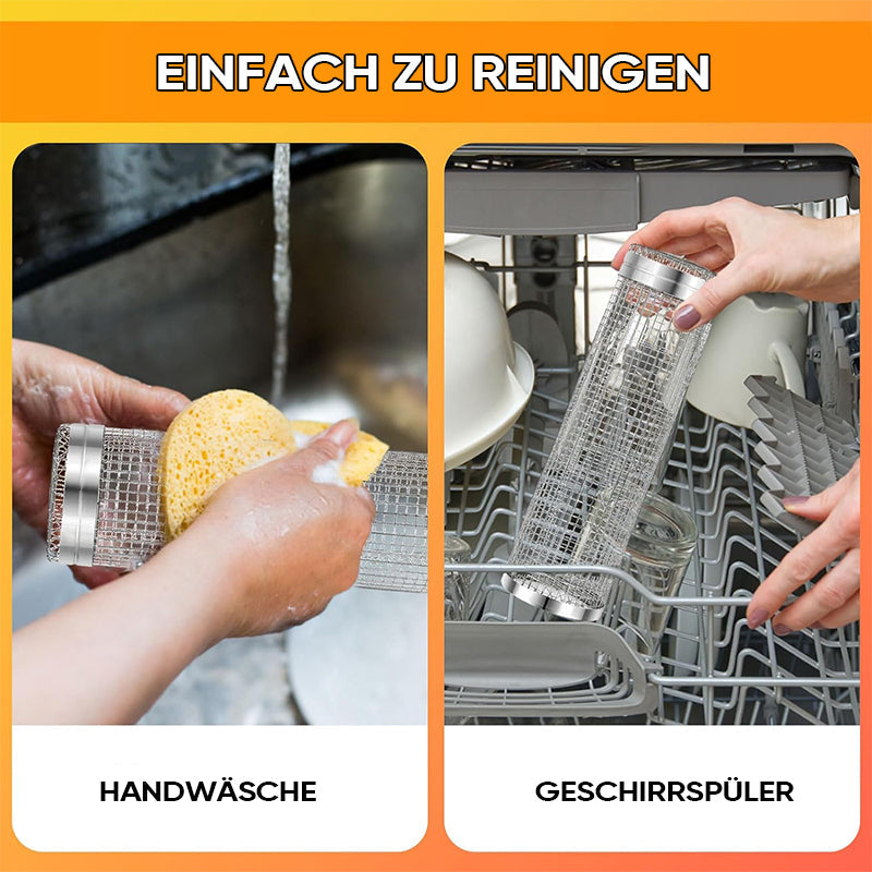 Holzgriff - Unser neu überarbeiteter Grillkorb mit Griffen lässt sich mühelos rollen, um eine gleichmäßige Erwärmung Ihrer Zutaten zu gewährleisten. Die Holzgriffe isolieren die Hitze und verhindern das Risiko von Verbrennungen.