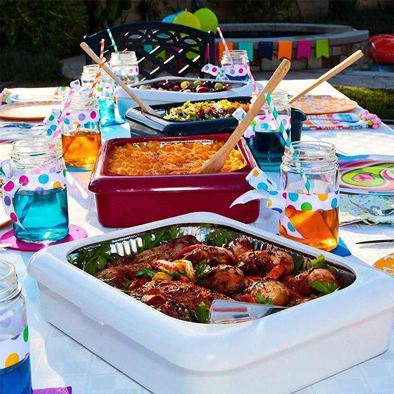 Die Alufolie Aufbewahrungsbox verschönert Ihre Einweg-Folienschale, damit sie auf Ihrem Tisch, bei BBQs, Potlucks, Picknicks, Catering, Büropartys, Feiertagsveranstaltungen und vielem mehr immer gut aussieht.