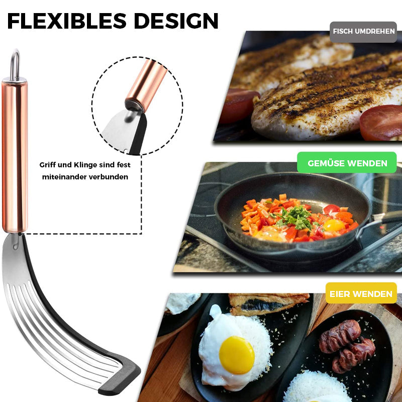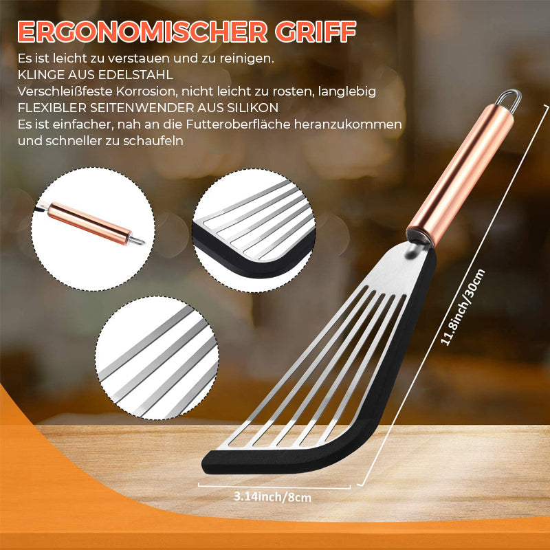 Flexibles Design: Die weiche Oberkante aus flexiblem, hochhitzebeständigem Silikon und die Edelstahlklinge machen das Kochen sicher, helfen, sich der Lebensmitteloberfläche zu nähern und schneller zu schaufeln; Verfügt über ein ergonomisches Design, das für Sie einfach zu handhaben ist. Das flexible Design ist bequem für Sie zu verwenden.