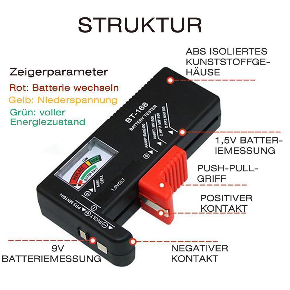 Der Tester benötigt zum Betrieb keine Batterien. Es funktioniert mit der Batterie, die Sie testen! Sie können es bequem in Ihrer Schublade, im Schrank oder an der Wand aufbewahren.