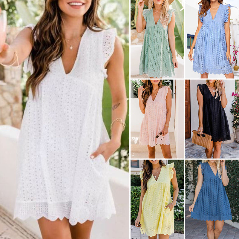 Einzigartiges Design: V-Ausschnitt, fließende kurze Ärmel, knapp über dem Knie, Mitte des Oberschenkels. Schöne Spitze, perfekte Taille. Kann mit Mänteln, Sneakers, High Heels getragen werden. Das kurzärmlige Spitzenkleid ist super elegant und schön, Sie können jede Menge Komplimente bekommen!