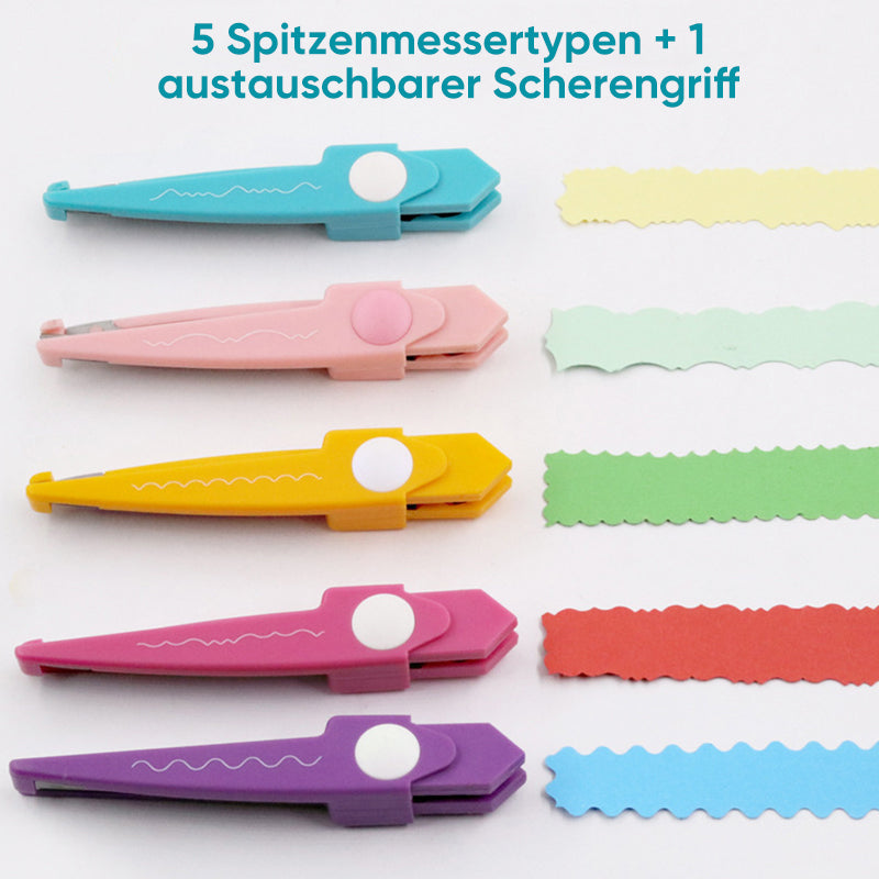 5 PAARE DEKORATIVES PAPIERKANTENSCHERE-SET - Mit 1 Griff, 5 schönen austauschbaren 2,5-Zoll-Schneideformen, phthalatfreien Kunststoffkomponenten und Edelstahlschneidkanten, gut für die Kunst- und Bastelarbeit von Kindern und Erwachsenen.