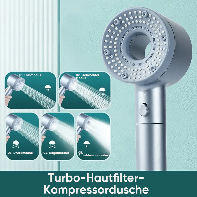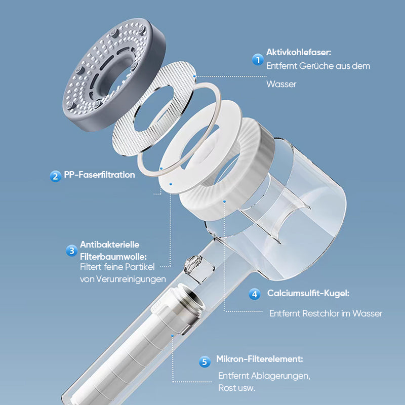 Plattenreinigung: Der verbesserte Silikon-Wasserauslass hat keine Angst vor Verstopfungen und kann einfach und schnell gereinigt werden, ohne zu splittern. Mehrere Wasserauslassmodi, fünf Geschwindigkeitsstufen und eine Ein-Knopf-Einstellung sorgen für ein besseres Duscherlebnis. Filtert und reinigt Verunreinigungen im Wasser durch hocheffiziente Filterung Schicht für Schicht, sodass Sie beruhigt Wasser trinken können, keine Gesundheitsrisiken hinterlassen und die Gesundheit der Haut Ihrer Familie geschützt werden.