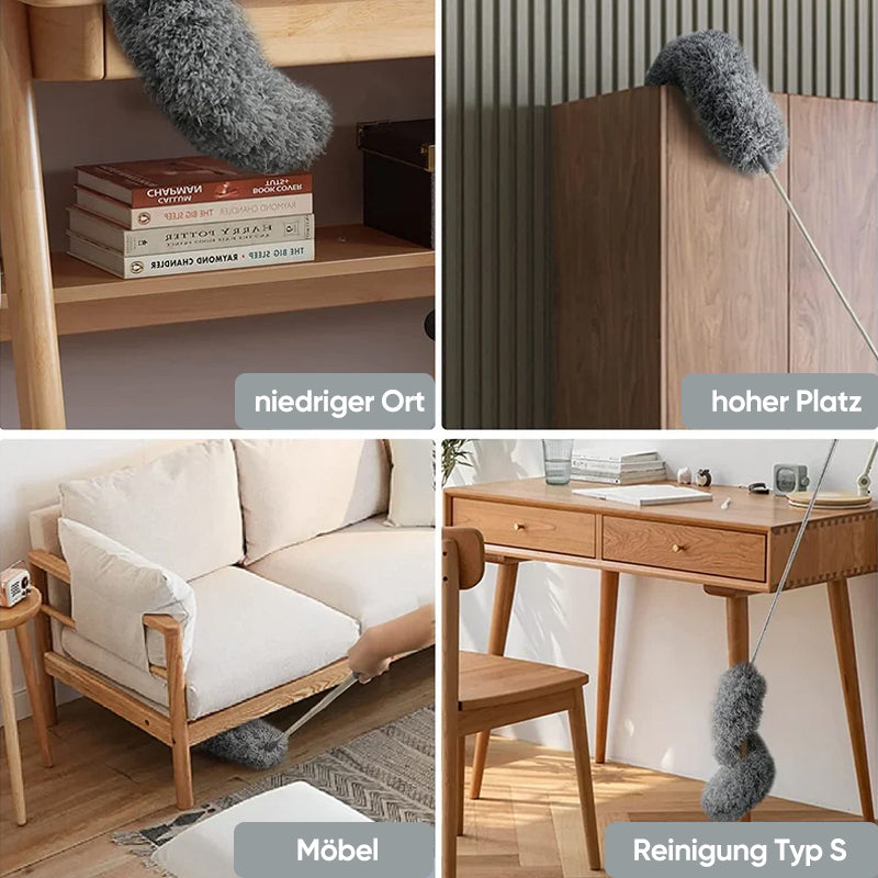 Mit der ausziehbaren Stange können Sie hohe Flächen wie Decken, Ventilatoren und Bilderrahmen problemlos erreichen, ohne eine Leiter zu benutzen oder auf einem Stuhl zu stehen.