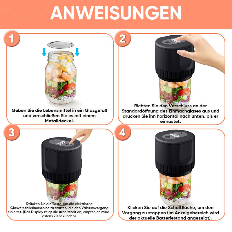 Erweiterte Lebensmittelfrische: Der aus hochdichtem ABS-Kunststoff gefertigte Vakuumierer für Einmachgläser erzeugt eine Vakuumumgebung im Glas und entfernt schnell Luft, um die Frische Ihrer Lebensmittel zu verlängern. Diese Innovation verhindert, dass Lebensmittel Feuchtigkeit und Gerüche aufnehmen und sorgt so dafür, dass Ihre Lebensmittel länger frisch bleiben.