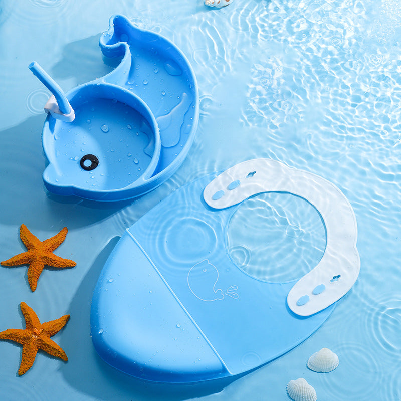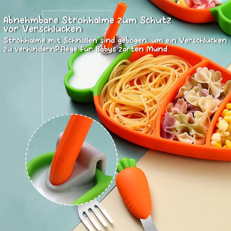 Exquisites Set: Baby-Silikonteller-Set. Das gut gestaltete Set aus Löffel und Gabel verfügt über weiche, karottenförmige Silikongriffe, die perfekt für die kleinen Hände von Babys geeignet sind. Der abnehmbare Strohhalm mit Schnalle ist gebogen, um ein Ersticken zu verhindern, und die sorgfältige Beachtung der Produktdetails schützt den empfindlichen Mund des Babys.