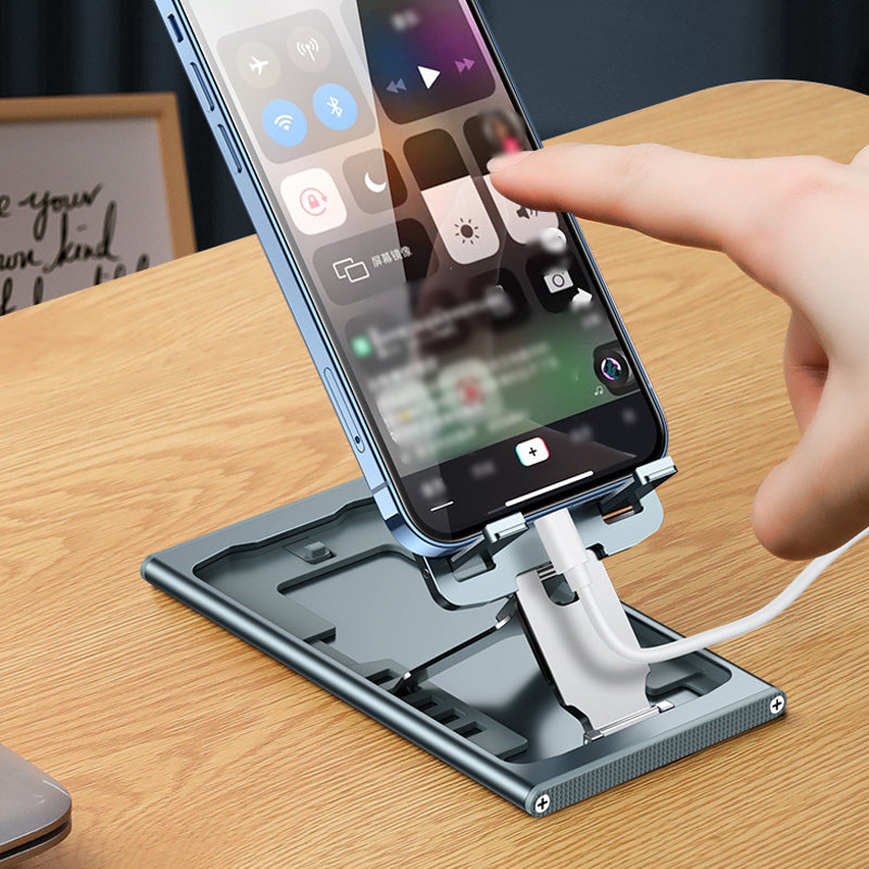 Humanisierte Design: Der Handyhalter kann beim Aufladen verwendet werden. Dieser stilvolle, verstellbare Telefonhalter hat ein zurückhaltendes Ladeloch-Design und unterstützt das Kabelmanagement. Dieser Telefonhalter deckt die Untertitel beim Ansehen von Videos nicht ab.