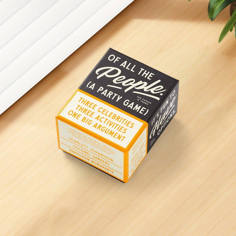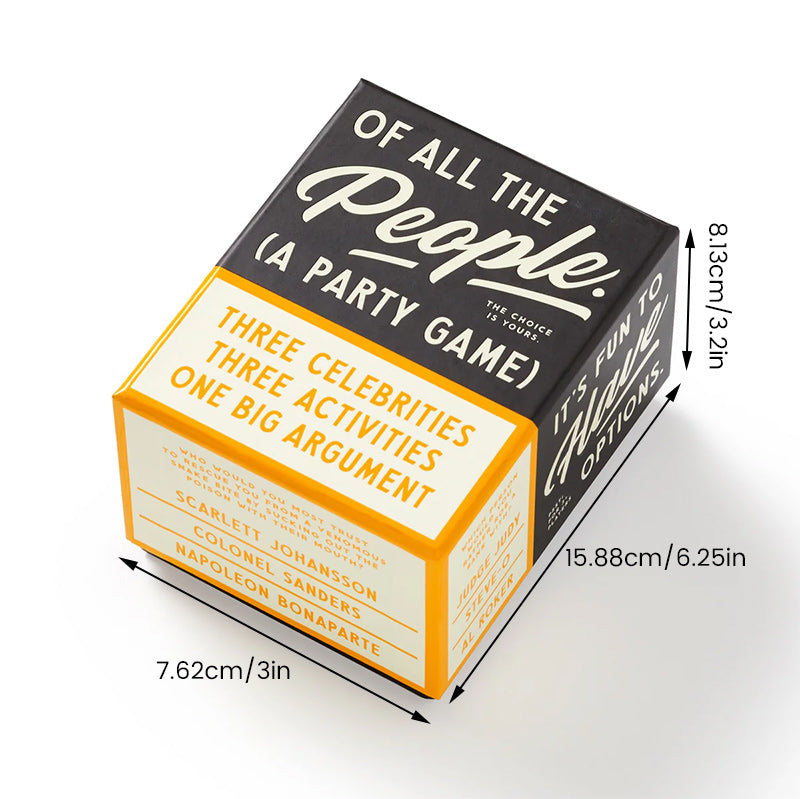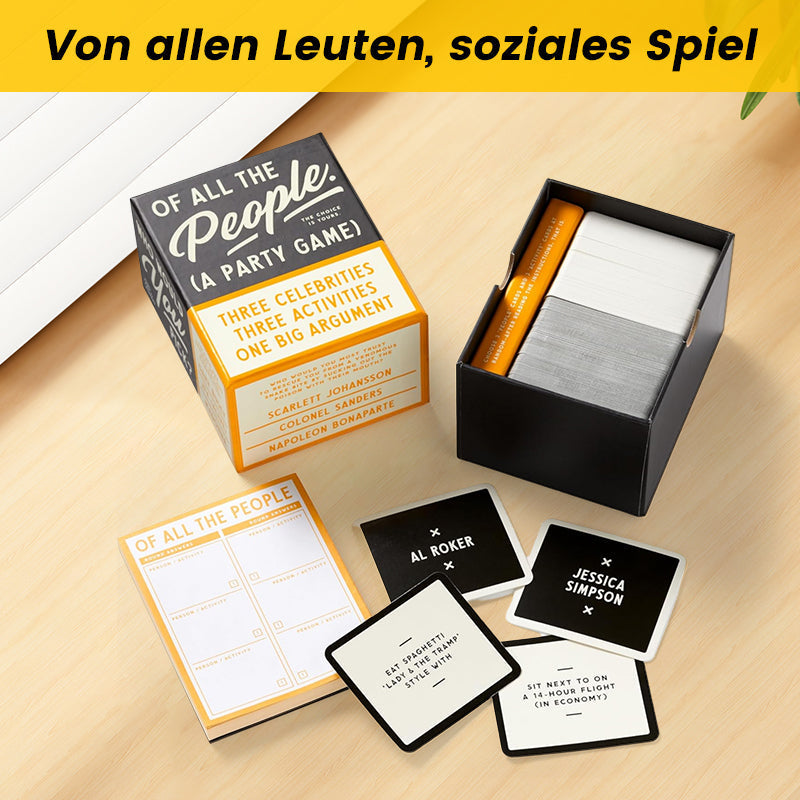 PERFEKTES PARTYSPIEL – Bringen Sie „Of All The People“ zu Ihrer nächsten Party mit und erleben Sie, wie es garantiert ein Hit wird! Sie glauben wirklich, dass Ihre Freunde auf einem 14-stündigen Flug lieber neben JFK als neben Madonna sitzen würden? Spielen Sie das Spiel und finden Sie es heraus! Es ist ein Spiel, das Ihnen eine Nacht voller lustiger Kombinationen und unvergesslicher Erinnerungen bescheren wird. Machen Sie sich darauf gefasst, dass sich alle Partygäste vor Lachen brüllen, wenn sie von allen Leuten erzählen, wen sie für diese verrückten Erlebnisse auswählen würden!