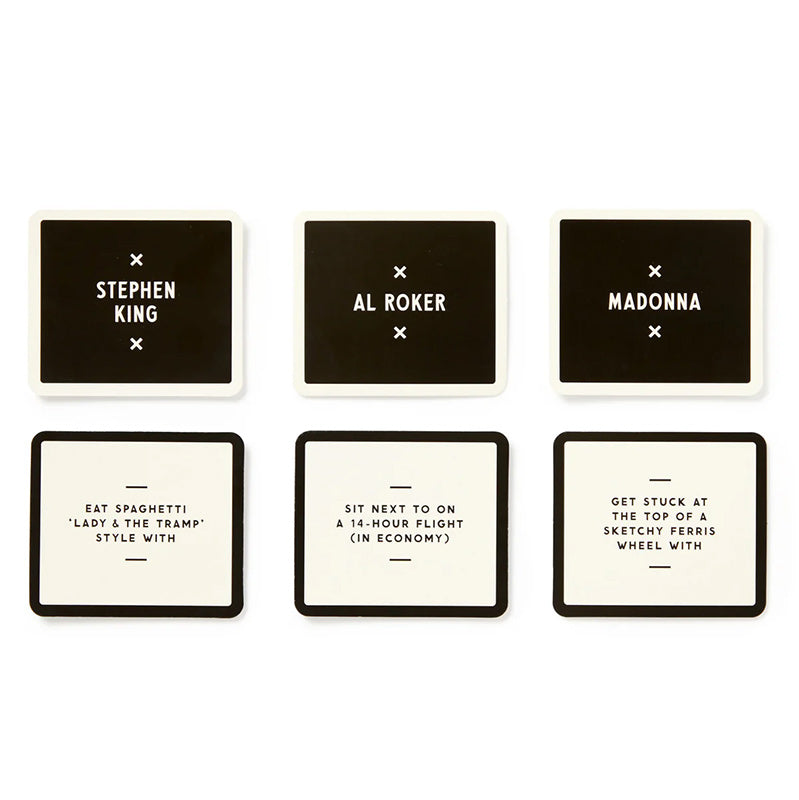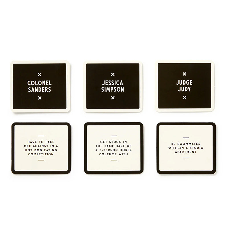 SPIELANLEITUNG – Die Spieler ziehen 3 zufällige „Promi“-Karten und 3 ebenso zufällige „Aktivitäts“-Karten – und diskutieren dann ausgiebig darüber, welche die idealen Paarungen ergeben würden. Allerdings gibt es einen Haken – Sie entscheiden nicht, welche Sie ziehen, sondern was Ihrer Meinung nach der „Richter“ dieser Runde wählen würde. Das heißt, Sie gewinnen Punkte dafür, dass Sie wissen, wie seltsam Ihre Freunde sind.