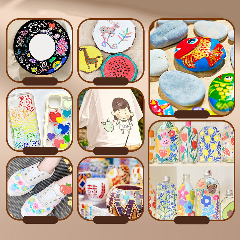 【Viele leuchtende Farben】 Die Farbmarker sind in vielen leuchtenden Farben erhältlich und können auf Holz, Gläsern, Ostereiern, Weihnachtskugeln, Karten, Steinen, Leinenschuhen, Holzspänen, Reifen, Tontöpfen usw. sowie Stoffmarkern verwendet werden. Sowohl Anfänger als auch Profis können ihrer Kreativität besser freien Lauf lassen!