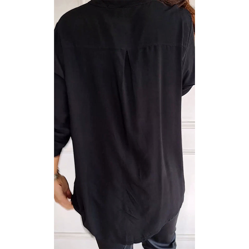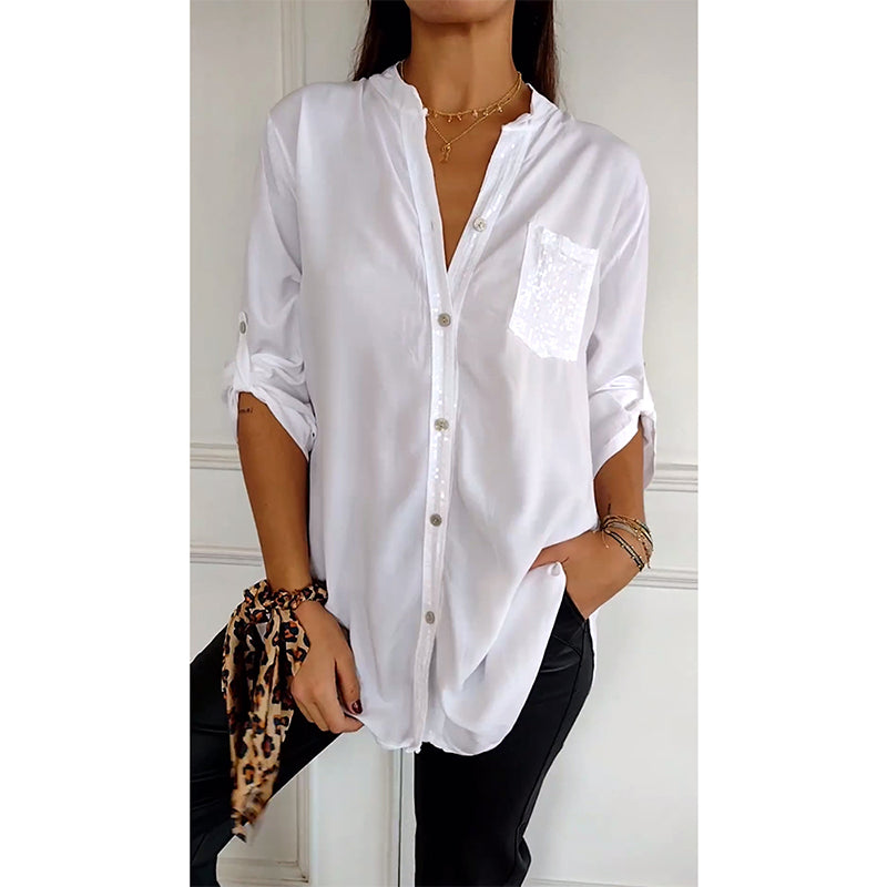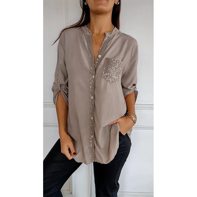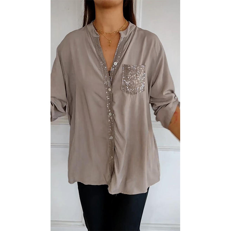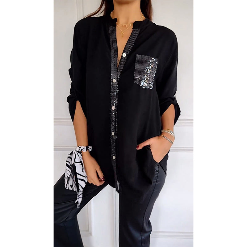 Vielseitig und stilvoll: Dieses langärmlige Paillettenhemd kann elegant oder leger getragen werden und eignet sich daher sowohl für legere als auch für formelle Anlässe.