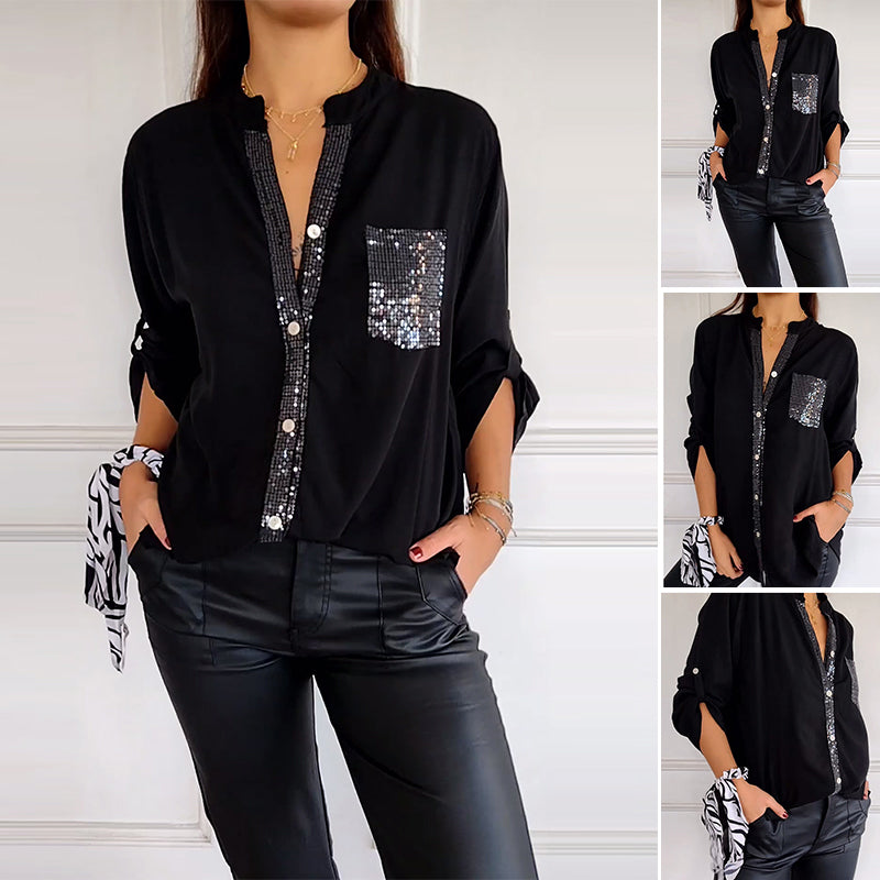 Das Hemd mit Paillettenknöpfen vorne besteht aus einem schillernden Paillettenmaterial auf der Oberfläche und einem weichen Polyesterfutter. Diese Langarmbluse mit Pailletten-Hemdknopf garantiert sowohl Komfort als auch Stil.