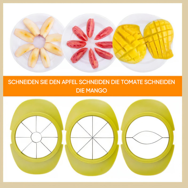 Unser 4-in-1-Obstschneider umfasst: Apfelentkerner und -schneider, Mangoschneider, Tomatenschneider und einen stabilen Sicherheitssockel. Geeignet für eine breite Palette von Gemüse und Obst, wie z.B. Äpfel, Birnen, Mangos, Orangen, Kiwis, Tomaten, Zwiebeln, Kartoffeln, usw., der Schneideeffekt ist perfekt.