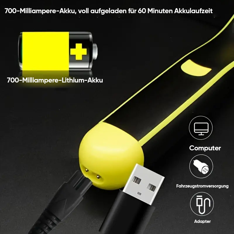 USB-Aufladung, eingebauter 700-mAh-Akku, kann bei voller Ladung 60 Minuten lang laufen und löst so das Problem der kurzen Akkulaufzeit; verwendet Universalspannung und mehrere Lademethoden, wie z. B.: Computer, Auto-Netzteil, Adapter und Powerbank usw.