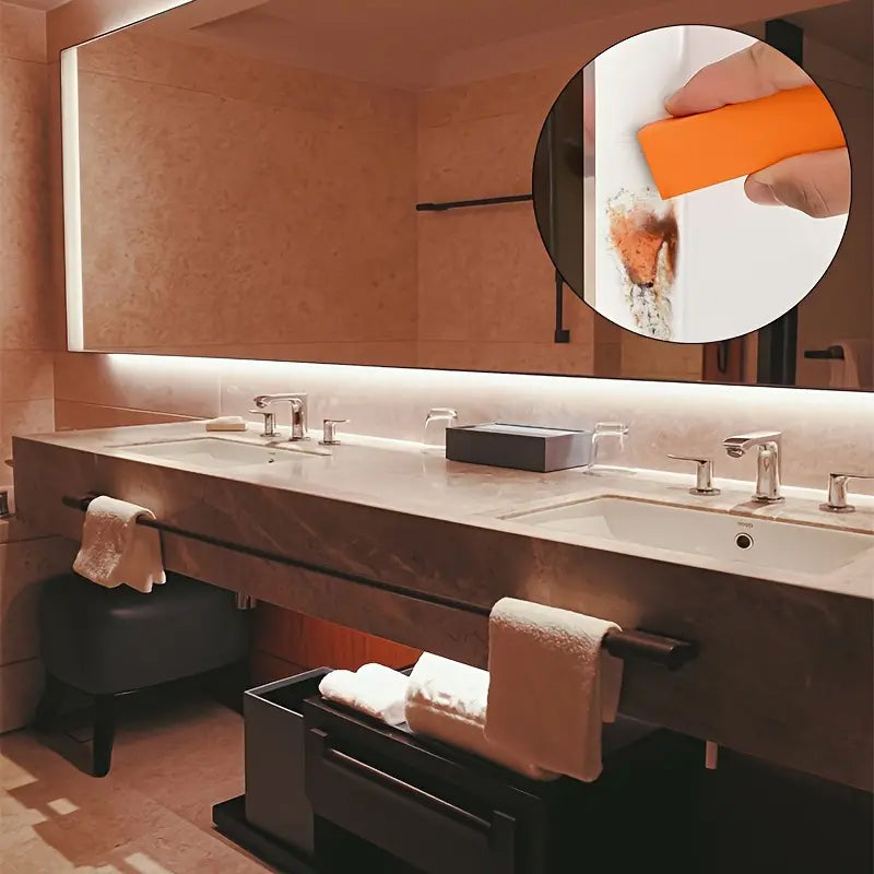 Verwenden Sie unseren Radiergummi, um Ihren Edelstahl gründlich zu reinigen! Es besteht aus strapazierfähigem, flexiblem Naturkautschuk und eignet sich perfekt zum Entfernen von hartnäckigem Schmutz, harten Wasserflecken und mehr von Wasserhähnen, Waschbecken und Duschen und stellt ihren ursprünglichen Glanz wieder her.