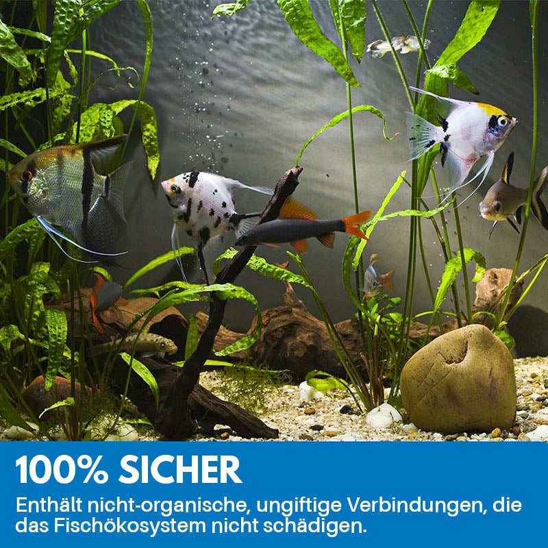 100% sicher -- Das Pulver ist eine ungiftige Verbindung, die dem Fischökosystem keinen Schaden zufügt. Es ist absolut sicher für Süßwasserteiche und umliegende Tiere und Pflanzen.