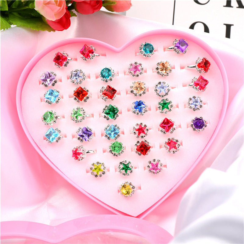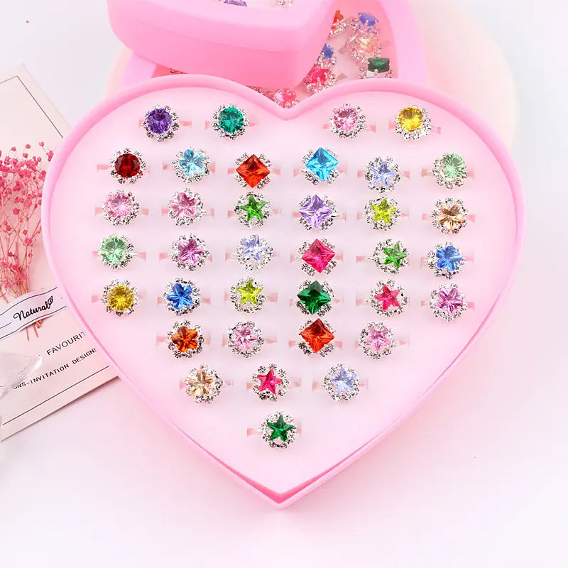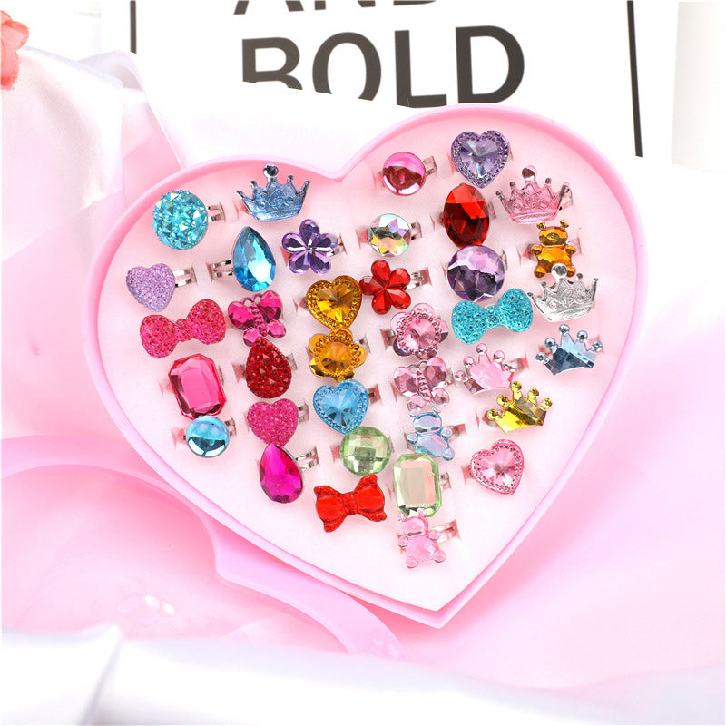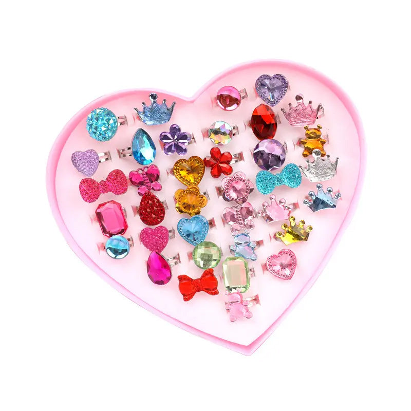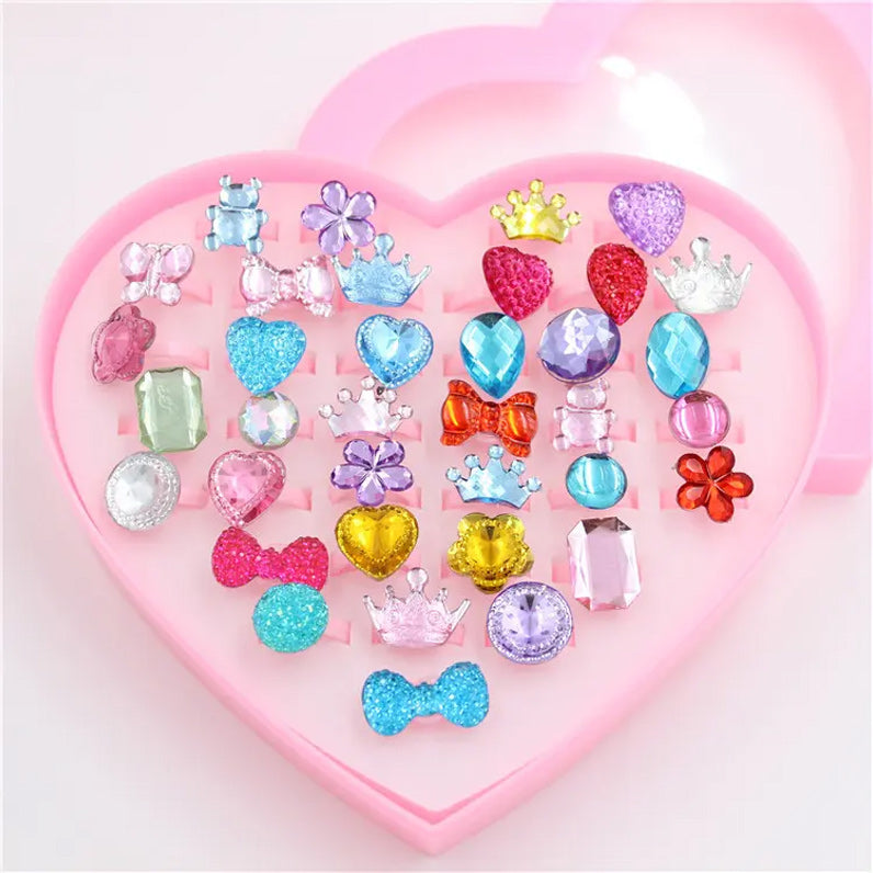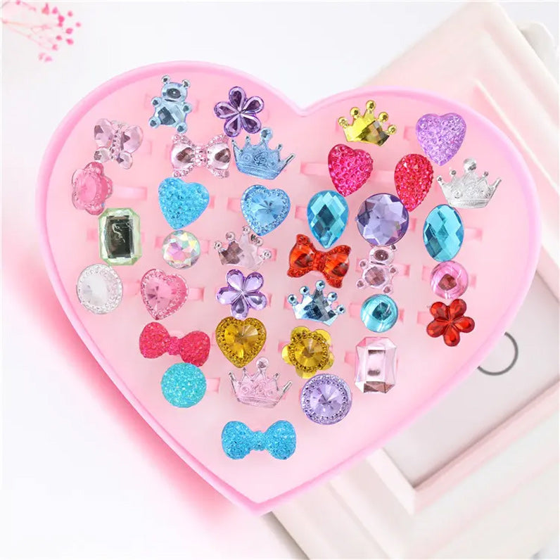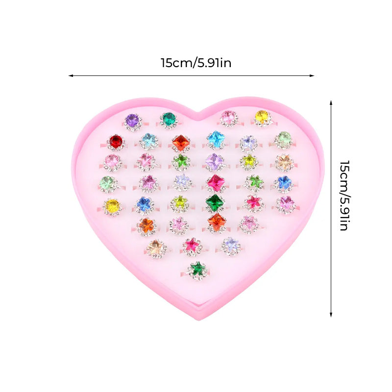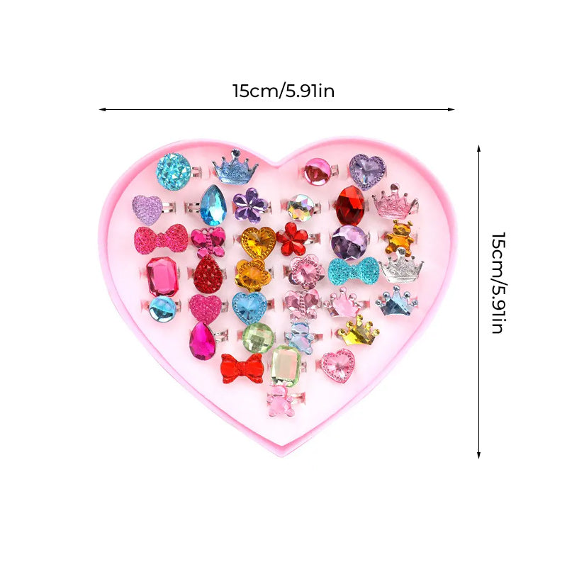 【36-teiliges Kinderring-Set】: Enthält 36 verschiedene Cartoon-Kinderschmuckstücke und eine herzförmige rosa Box. Die Vielfalt der Ringformen ist so bunt und mädchenhaft.