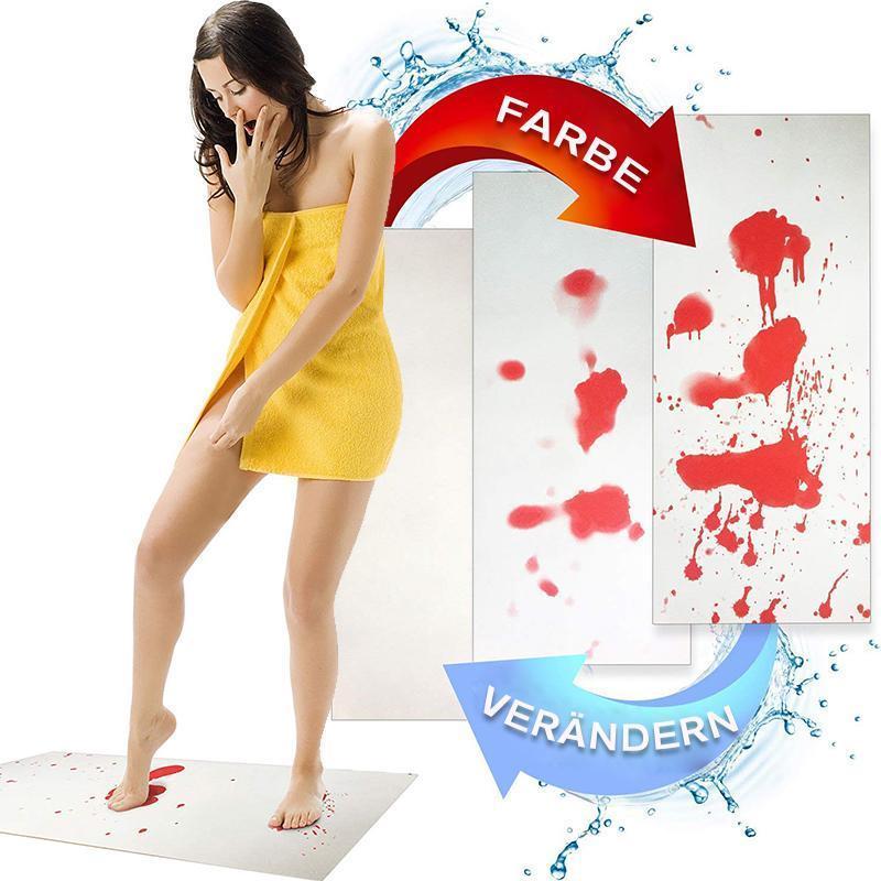 Das "Blut" verschwindet, nachdem der Badteppich getrocknet ist. Zum Trocknen aufhängen und beobachten, wie es wieder seine ursprüngliche Farbe annimmt.