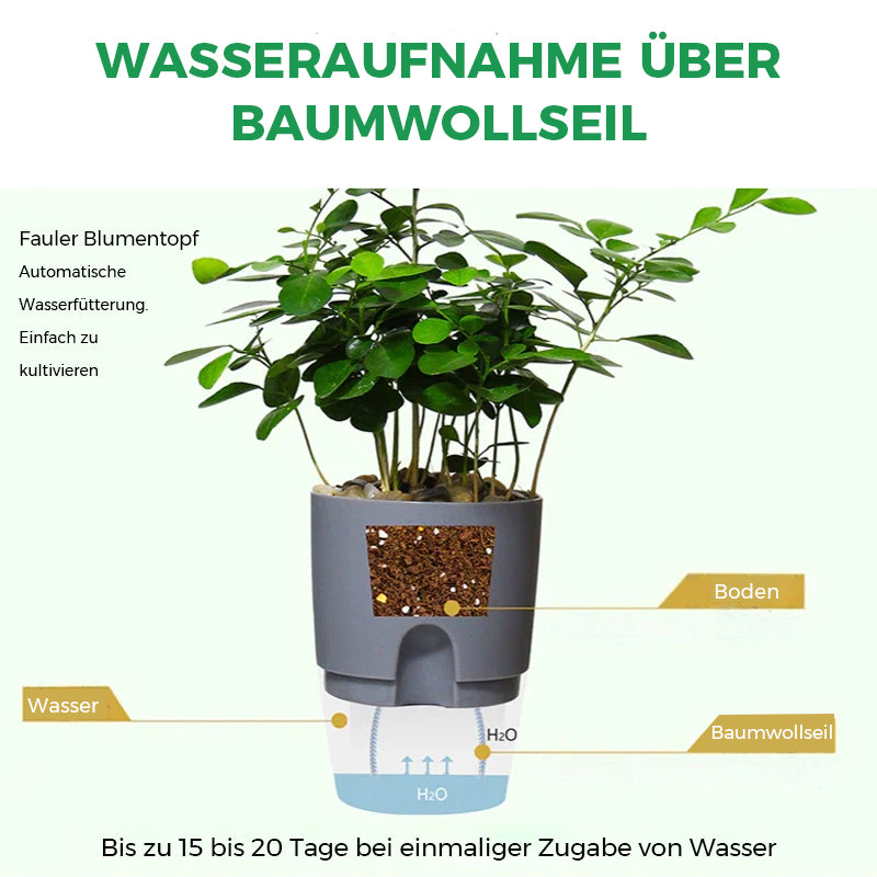 Pflanzen trinken ihr Wasser nur dann durch das Baumwollseil, wenn sie es brauchen. Die Form hat viele kleine Löcher auf der Unterseite, die für eine Luftzirkulation durch die Unterseite sorgen sollen.