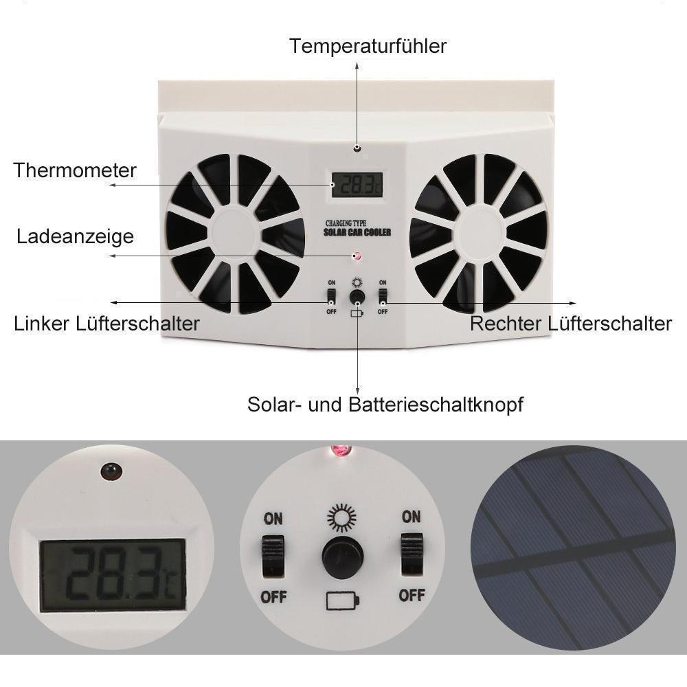 - Zwei Energieoptionen: Dieser Autolüfter mit äußeren Sonnenkollektoren, Doppelkanal und Doppelmotor-Design verbessert die Abgasgeschwindigkeit effektiv. Solar- und Batterieschaltersteuerung können die separat verwendete Solarbatterie steuern. Wenn Sie den Akku nicht benutzen, können Sie sich direkt auf Sonnenenergie verlassen, um Sonnenlicht in Strom umzuwandeln, damit der Lüfter funktioniert.