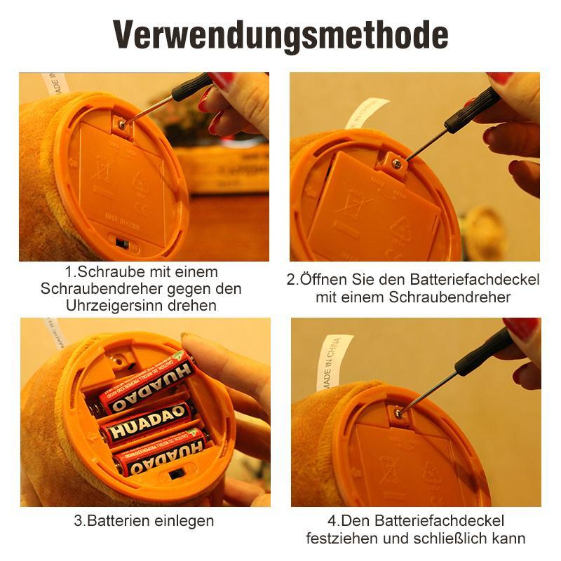 Einfach zu verwenden: Öffnen Sie den Batteriefachdeckel an der Unterseite und setzen sie die batterie ein. Schließen Sie den Batteriefachdeckel. Schalten Sie den schwarzen Schalter in der Nähe ein. Stellen Sie es auf einen Schreibtisch oder eine ebene Fläche, dann beginnt es mit Musik zu tanzen.