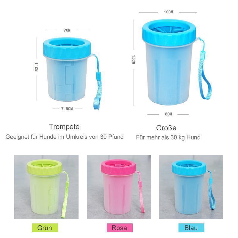 Einfach Wasser hinzufügen, die schmutzige Pfote einlegen, die Tasse drehen, dann die Pfote trocken halten, um schnell und tief sauber zu sein. Wiederholen für alle vier Pfoten.