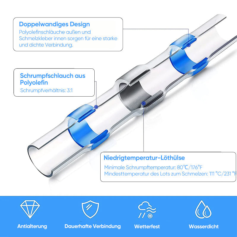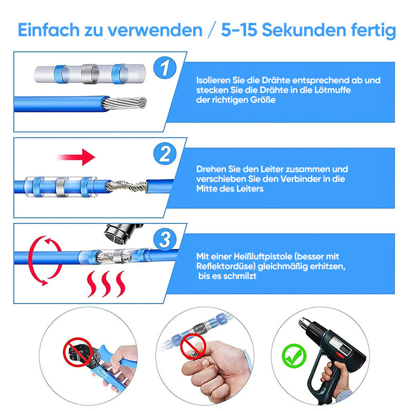 Arbeiten Sie bei allen Elektroarbeiten schneller und effizienter. Einfach aufstecken, erhitzen und versiegeln, und Sie müssen sich nie wieder Gedanken über zufällige Verbindungen machen.