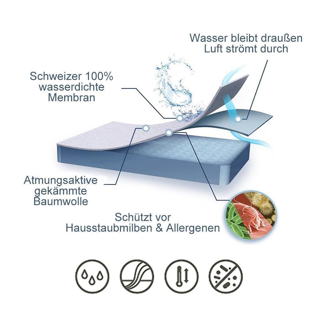 💦 Die 100% wasserdichte Membraninnenseite kann alle Flüssigkeiten effektiv abweisen, einschließlich Körperflüssigkeiten, Schweiß, Urin und versehentlichem Verschütten. Es verhindert, dass Flüssigkeitsunfälle Ihre Königsmatratze dauerhaft verschmutzen.